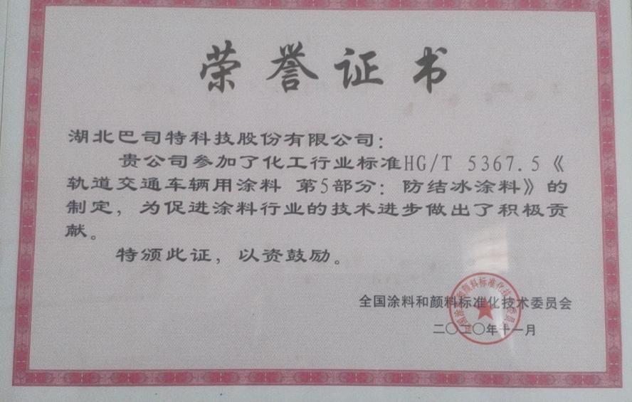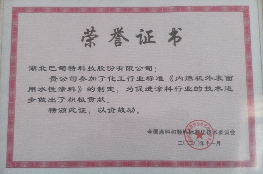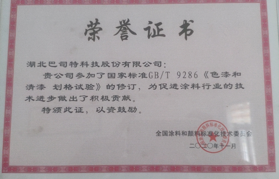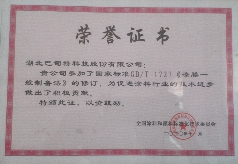 如今,巴司特科技作為標準主要起草人,正在修制定GB/T 6739《色漆和清漆 鉛筆法測定漆膜硬度》、HG/T4346《涂料用氯化橡膠樹脂》、HG/T《透水道路用涂料》等相關工作。在未來,巴司特科技將承擔越來越多的國家標準、行業標準的制定和修訂任務,全面實施質量強企和標準化戰略,進一步提升了品牌影響力。