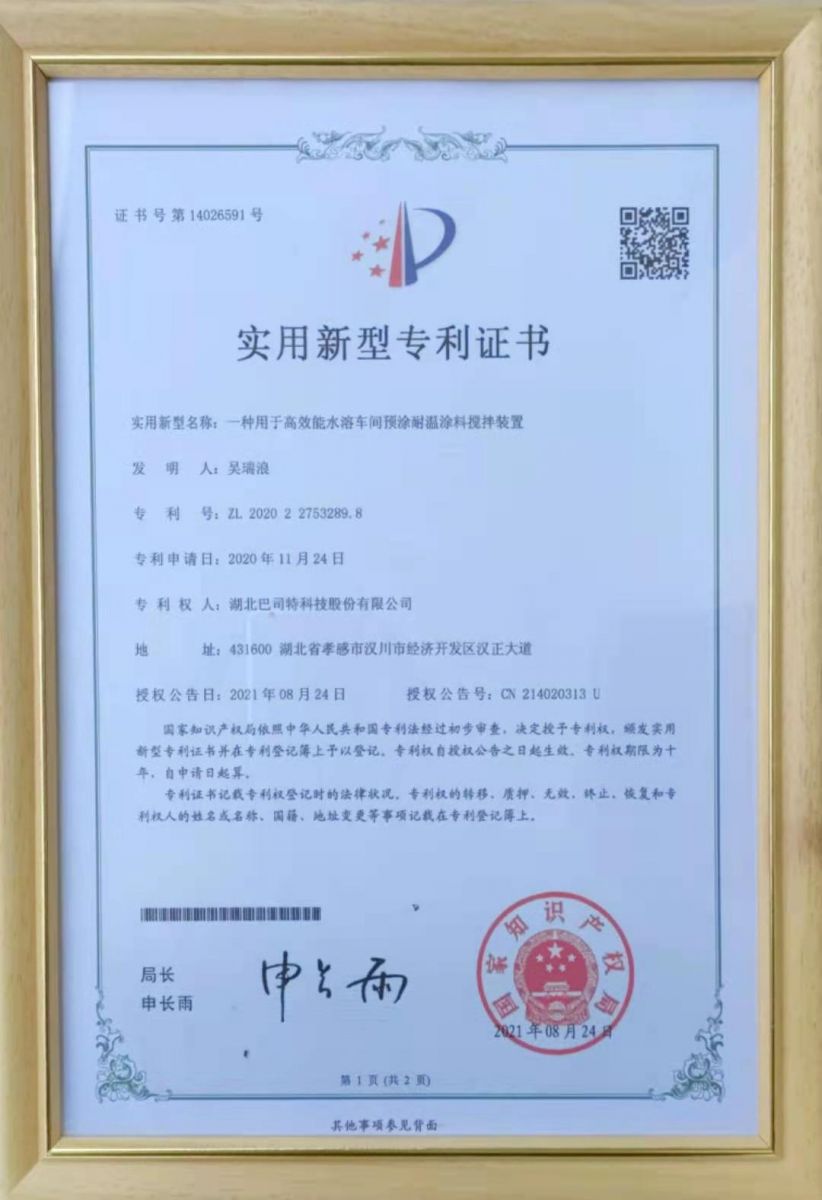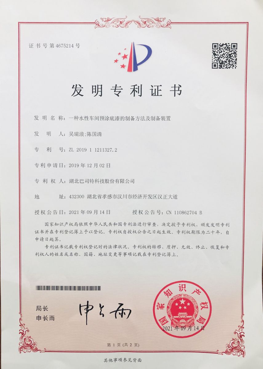 熱烈祝賀湖北巴司特科技股份有限公司于2021年新獲《一種水性車間預涂底漆的制備方法及制備裝置》一項發明專利證書,《一種高效能水溶車間預涂底漆混合裝置》、《一種水溶車間預涂底漆制漿裝置》、《一種水溶車間預涂抗焊接涂料真空吸料系統》、《一種用于水溶車間預涂耐溫涂料攪拌裝置》四項實用專利證書。