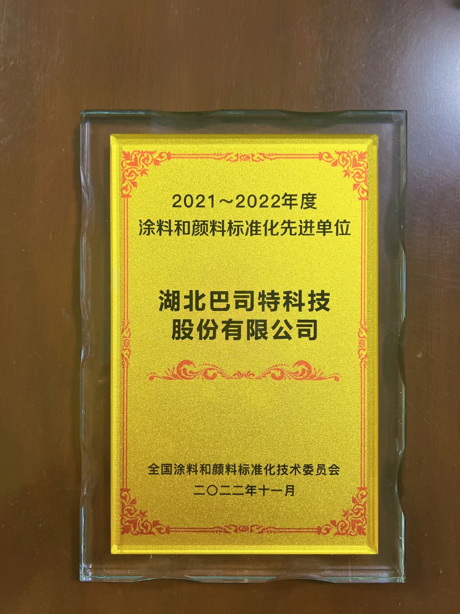湖北巴司特科技股份有限公司在行業中多年的深耕與布局,參與HG/T 3668-2020《富鋅底漆》標準修訂、HG/T 4346-2022 《涂料用氯化橡膠樹脂》標準修訂、HG/T5367.5-2022 《軌道交通車輛用涂料 第5部分:防結冰涂料》標準制定等等,得到全國涂料和顏料標準化技術委員會認可,獲得2021~2022年度涂料和顏料標準化先進單位稱號。